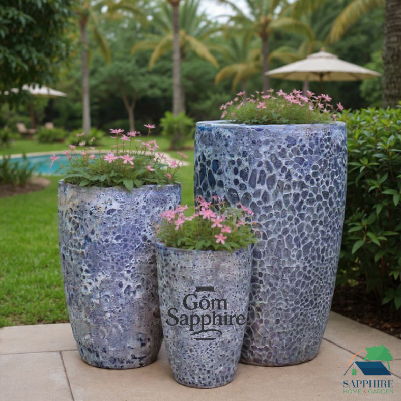 Sở hữu vẻ đẹp mộc mạc nhưng không kém phần tinh tế, bộ chậu gốm men xanh xám họa tiết bọt đá mang đến cảm giác an nhiên và sang trọng cho không gian sống. Lớp men hiệu ứng sôi tự nhiên tạo nên những hoa văn loang đậm – nhạt đầy ngẫu hứng, như bề mặt đá núi bị gió và thời gian bào mòn, mang đậm tinh thần rustic – tự nhiên – chân thật.