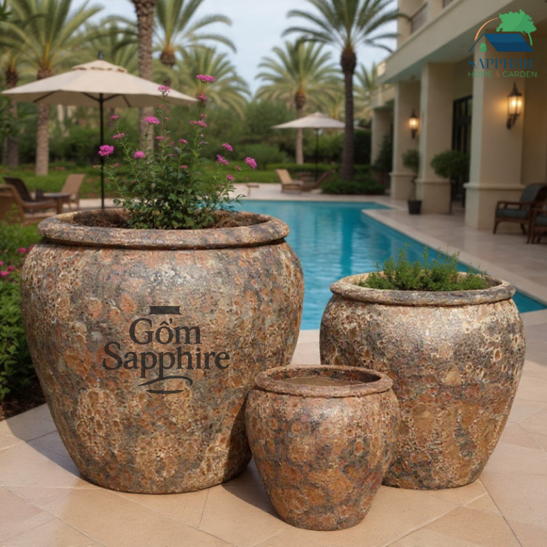 Mang đậm hơi thở của thiên nhiên, Bộ Chậu Gốm Dáng Tròn là lựa chọn hoàn hảo cho những ai yêu thích sự mộc mạc nhưng vẫn toát lên vẻ sang trọng tinh tế. Bề mặt chậu được xử lý tạo hiệu ứng loang màu độc đáo, kết hợp cùng tông nâu ấm pha xám tự nhiên, mang lại cảm giác gần gũi, cổ điển nhưng không kém phần hiện đại.