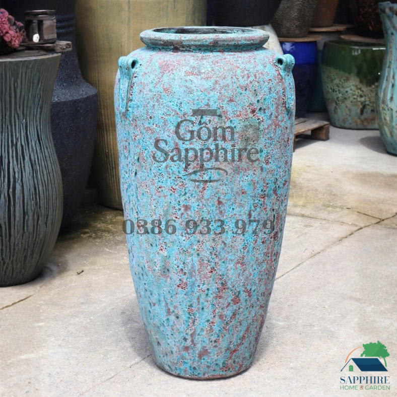 Mẫu chóe men sôi xanh nổi bật nhờ lớp men sôi đặc trưng tạo nên các hốc tổ ong nhỏ li ti trên bề mặt, mang lại hiệu ứng độc đáo và sống động như những mảng đá tự nhiên được thời gian bào mòn. Sắc xanh ngọc pha trầm kết hợp với các điểm loang màu nâu – đỏ tạo chiều sâu thị giác, giúp sản phẩm trở thành điểm nhấn nổi bật trong mọi không gian.