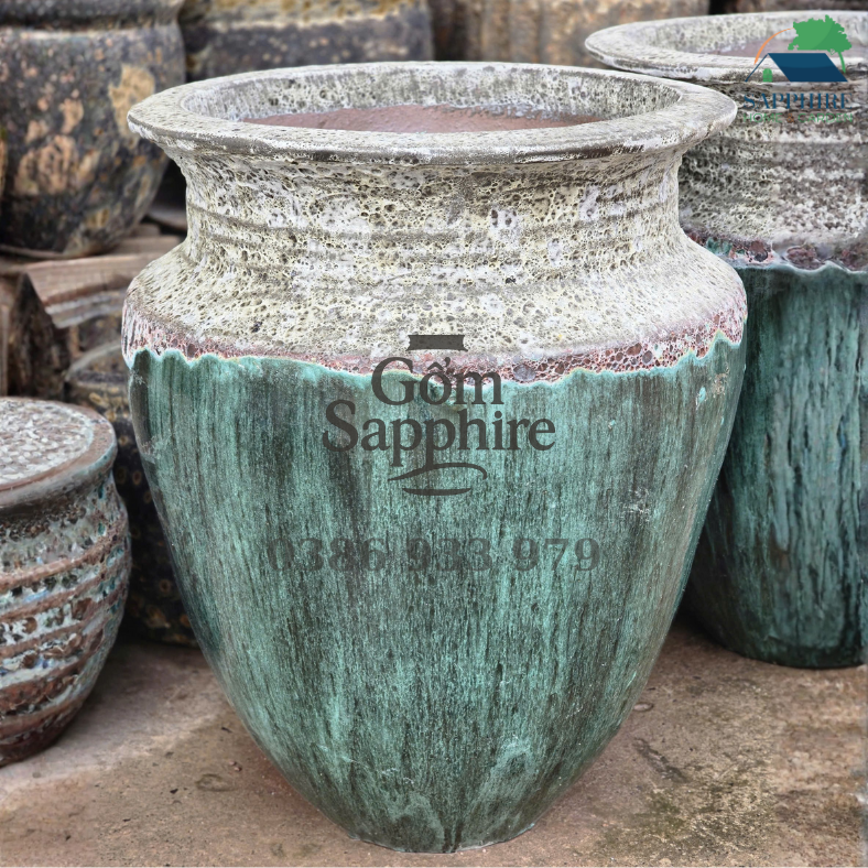 Sự chuyển tiếp từ lớp men sôi trắng xám xuống gam rêu xanh cổ điển tạo nên hiệu ứng thị giác mềm mại nhưng đầy cá tính, khiến chậu trở thành điểm nhấn nổi bật trong mọi không gian. Từng mảng màu, từng vệt men đều được hình thành hoàn toàn tự nhiên qua quá trình nung nhiệt độ cao, giúp mỗi chiếc chậu trở thành một tác phẩm độc bản.