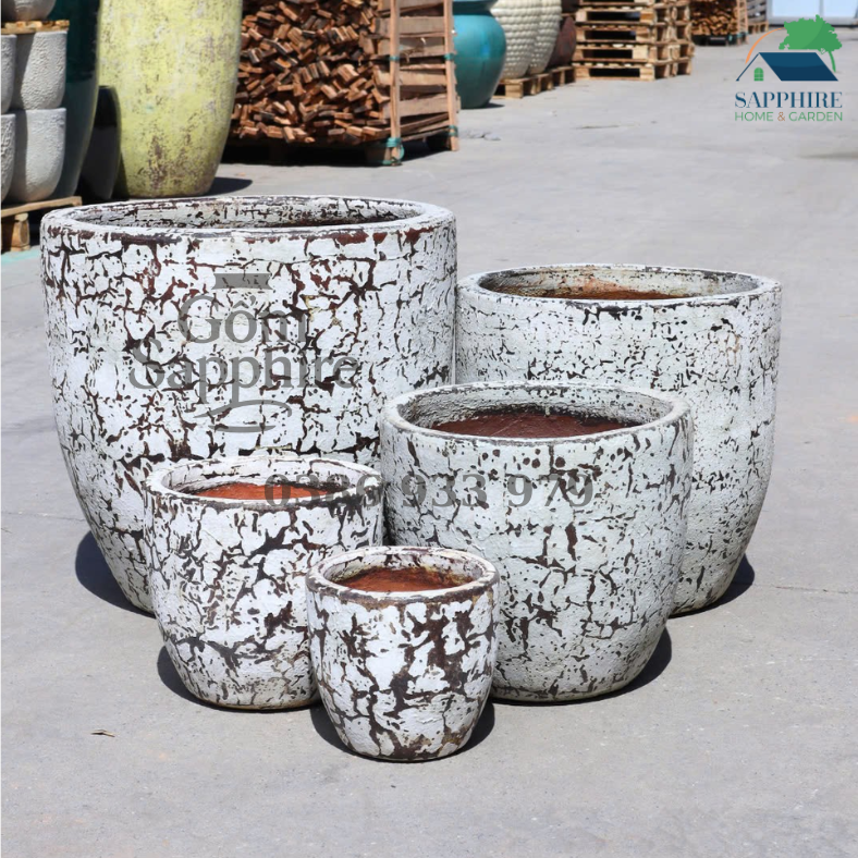 Tông màu trắng ngà – nâu đất hòa quyện tạo nên sự đối lập bắt mắt nhưng vẫn giữ được nét trầm mặc, cổ kính. Mỗi chiếc chậu đều có hoa văn tự nhiên không trùng lặp, giúp không gian trở nên nổi bật và cá tính hơn.