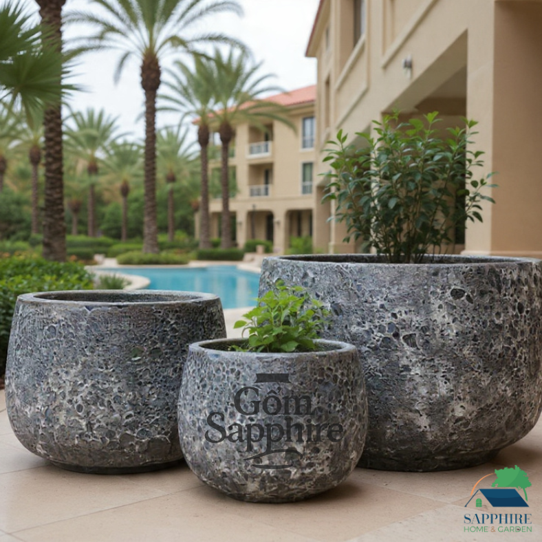 Được làm từ chất liệu gốm cao cấp, chậu có độ bền cao, chịu được thời tiết ngoài trời và thích hợp cho cả không gian nội thất lẫn ngoại thất. Dù được đặt trong khu vườn, sân thượng hay sảnh nhà, bộ chậu gốm này đều tạo điểm nhấn sang trọng và gần gũi với thiên nhiên.