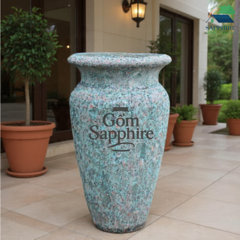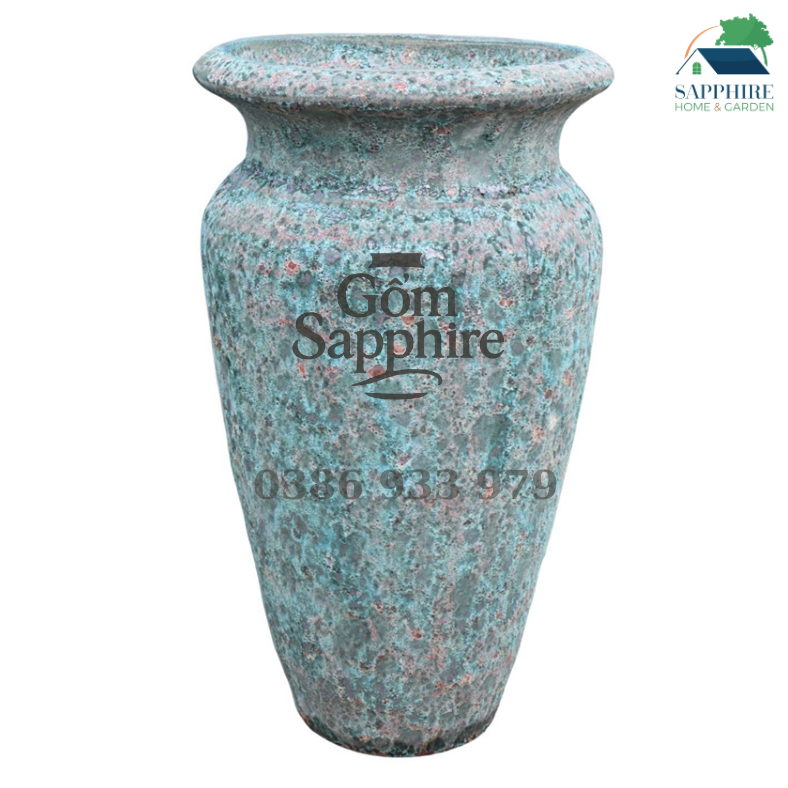 Chậu men sôi xanh cổ sở hữu vẻ đẹp nghệ thuật độc đáo, được tạo nên từ kỹ thuật nung gốm truyền thống kết hợp lớp men sôi tự nhiên. Tông xanh ngọc pha rêu cổ, điểm xuyết những hạt men nâu đỏ loang nhẹ, mang lại cảm giác trầm tĩnh, mộc mạc nhưng vẫn sang trọng, gợi liên tưởng đến vẻ đẹp phong hóa của thời gian.