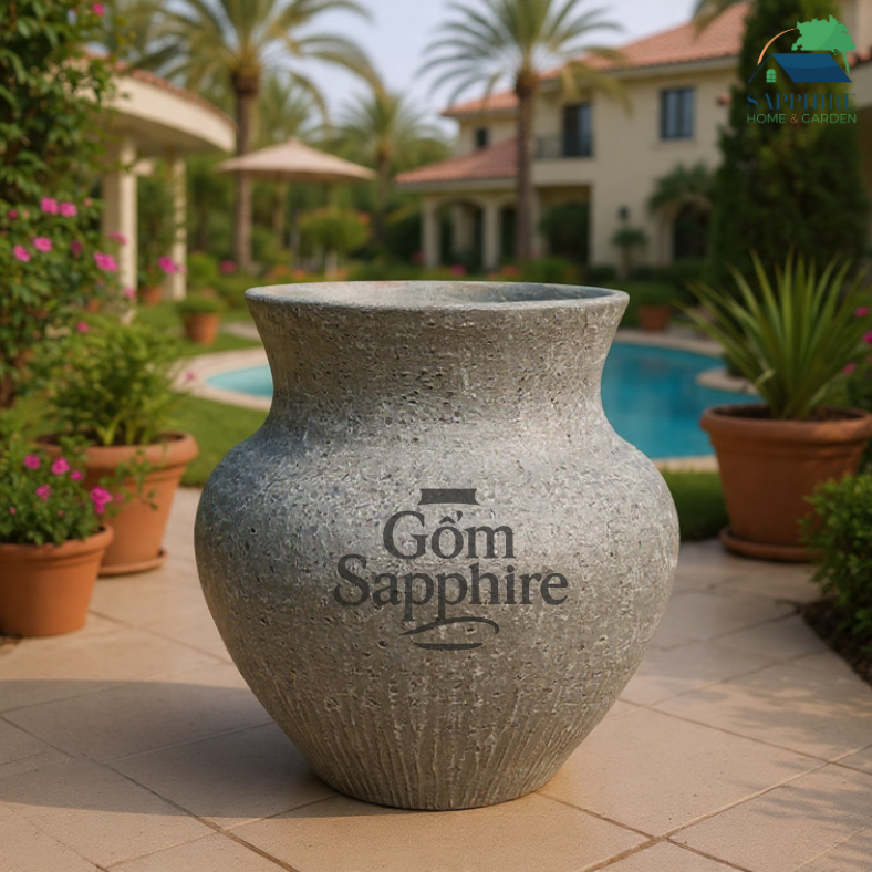 Thiết kế dáng phình thân – thu miệng nhẹ, kết hợp các đường vân dọc ở phần chân chậu, giúp tổng thể trở nên hài hòa, vững chãi và giàu tính nghệ thuật. Sản phẩm được sản xuất từ gốm nung nhiệt độ cao, đảm bảo độ bền, chắc chắn và khả năng sử dụng lâu dài trong nhiều điều kiện không gian.