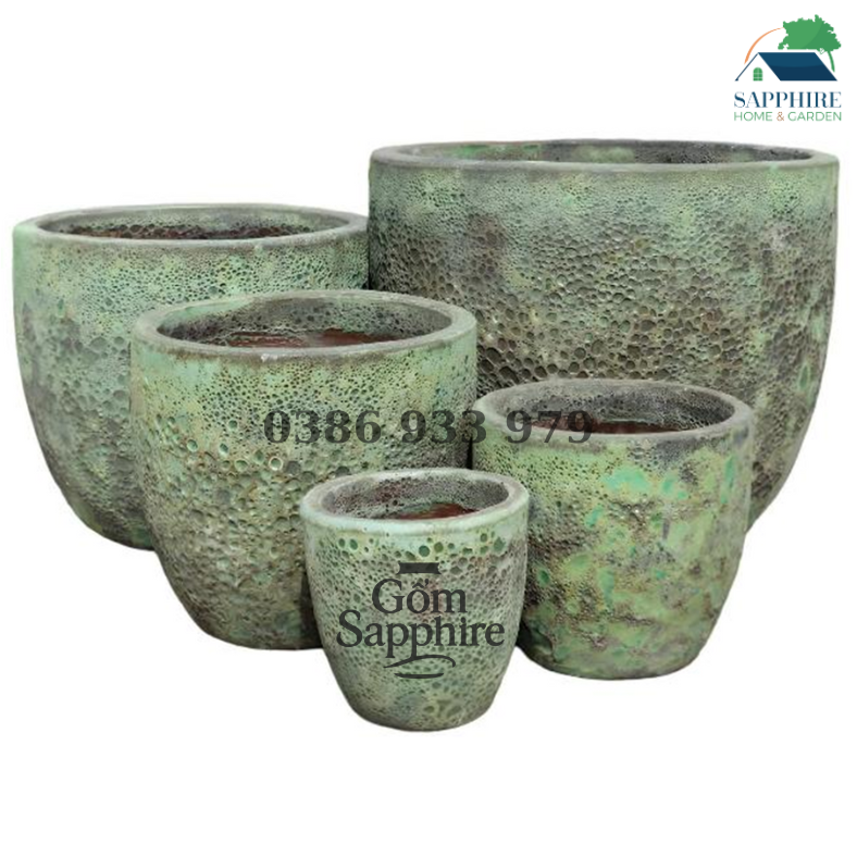 Màu xanh rêu nhạt xen lẫn các mảng xám trầm tạo chiều sâu cho bề mặt chậu, giúp mỗi sản phẩm đều mang vẻ đẹp độc nhất. Lớp men được tạo thủ công bằng kỹ thuật nung nhiệt độ cao, khiến bề mặt chậu có hiệu ứng “lỗ tổ ong” tự nhiên – đặc trưng riêng của dòng Atlantis cao cấp.