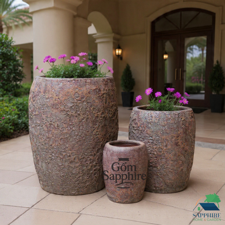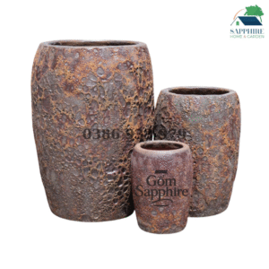 Bộ chậu gốm Dark Rustic gây ấn tượng mạnh với bề mặt hiệu ứng gỉ sét tự nhiên, mang sắc nâu đậm – xám – đồng cháy hòa quyện đầy chiều sâu. Kết cấu bề mặt men sôi (lava texture) tạo nên sự thô mộc đặc trưng, giống như lớp patina được thời gian bào mòn qua nhiều năm.
