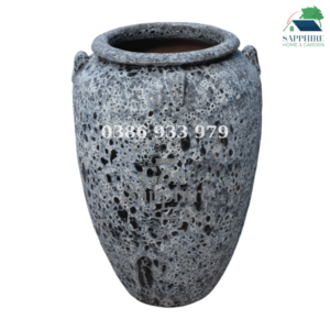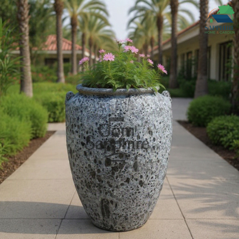 Chậu gốm men sôi đen sở hữu vẻ đẹp mạnh mẽ và đầy chiều sâu, nổi bật với bề mặt men sôi tự nhiên tạo hiệu ứng lỗ khí li ti độc đáo. Sắc đen – xám tro hòa quyện, loang đậm nhạt ngẫu nhiên trong quá trình nung nhiệt độ cao, mang đến cảm giác thô mộc, cá tính nhưng vẫn rất sang trọng.