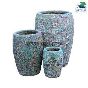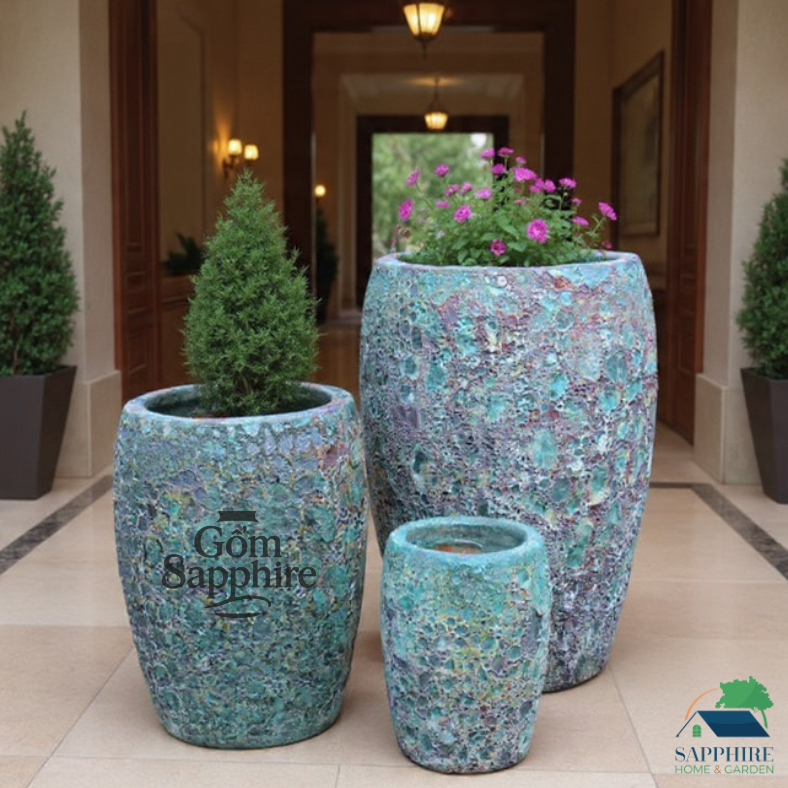 Bộ chậu gốm Green Atlantis ghi dấu bằng bề mặt hiệu ứng đá tự nhiên độc đáo, hòa trộn những gam màu xanh ngọc, tím, vàng gỉ và sắc rêu tự nhiên. Sự pha trộn màu sắc ngẫu hứng tạo nên vẻ ngoài mộc mạc nhưng vẫn đầy chiều sâu, mang cảm giác như một phiến đá cổ được thời gian “chạm khắc”.