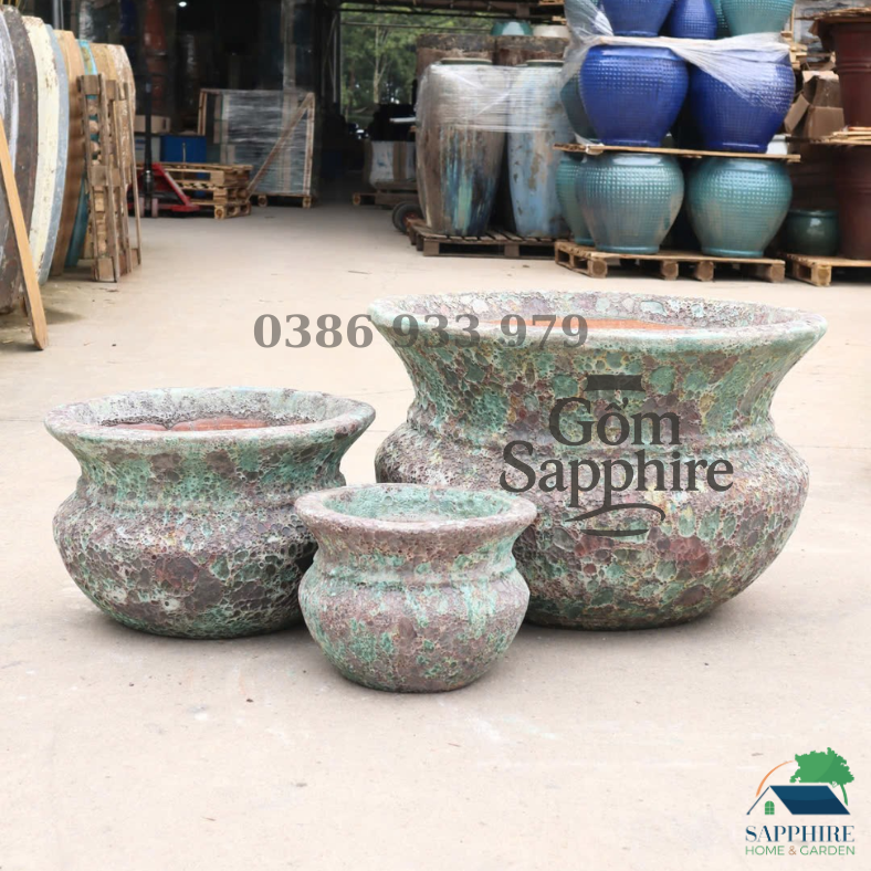 Bộ chậu men sôi xanh nổi bật nhờ lớp men sôi đặc trưng tạo nên vô số hốc li ti dạng tổ ong trải đều trên bề mặt. Tông xanh rêu – xanh ngọc hòa quyện cùng sắc nâu đất và những mảng loang tự nhiên mang đến vẻ đẹp như sự phong hoá của đá cổ, tạo chiều sâu và tính nghệ thuật cho từng sản phẩm. Mỗi chiếc chậu đều là một phiên bản độc bản, không chậu nào giống chậu nào.