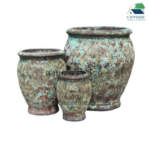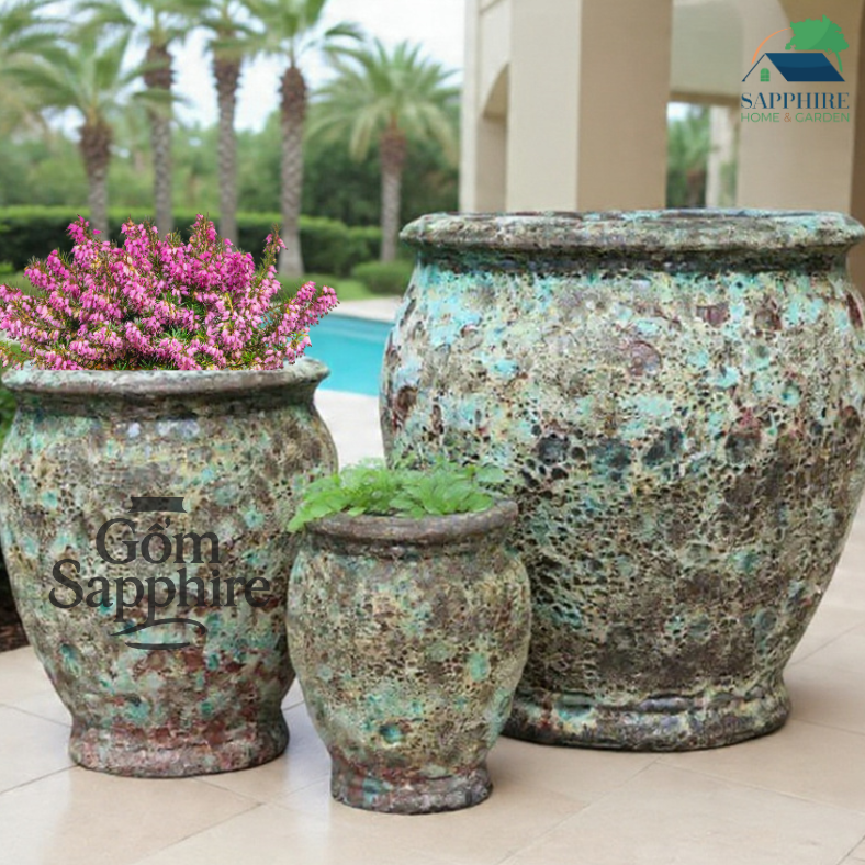 Hoàn hảo cho biệt thự, khu nghỉ dưỡng, sân vườn hoặc hiên nhà, bộ chậu gốm men cổ xanh đồng mang lại cảm giác cổ điển, sang trọng và gần gũi với thiên nhiên.