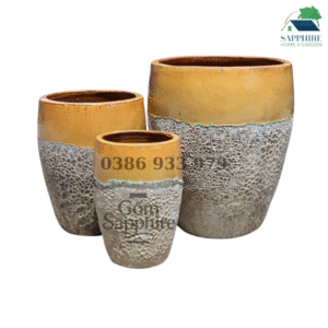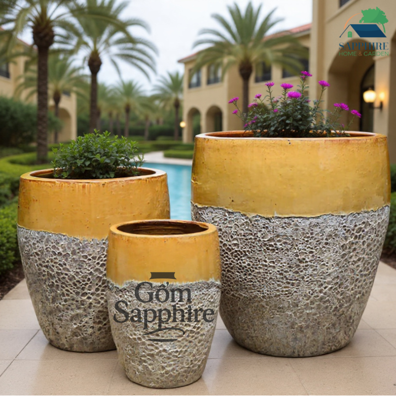 Mang sắc vàng ấm áp của nắng và gam xám tự nhiên của đất đá, Bộ Chậu Gốm Men Vàng Cát Nghệ Thuật là sự kết hợp hoàn hảo giữa nét mộc mạc và phong cách hiện đại. Phần thân chậu được tạo hiệu ứng nổi tinh tế, gợi hình ảnh những lớp cát biển hoặc đá tổ ong, tạo nên chiều sâu và cảm giác tự nhiên đầy cuốn hút.