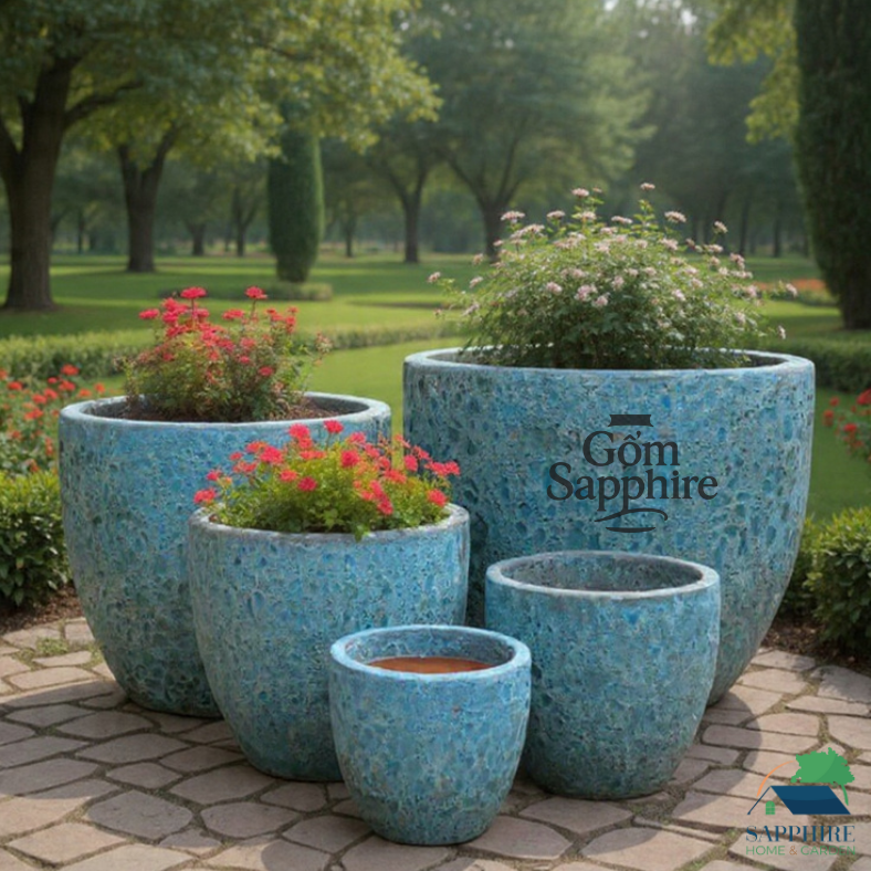 Bộ chậu gồm nhiều kích thước khác nhau, giúp bạn dễ dàng phối hợp để trồng các loại cây xanh, cây cảnh, hoa hoặc cây phong thủy – từ trong nhà, ban công cho đến sân vườn, resort hay quán cà phê ngoài trời.
