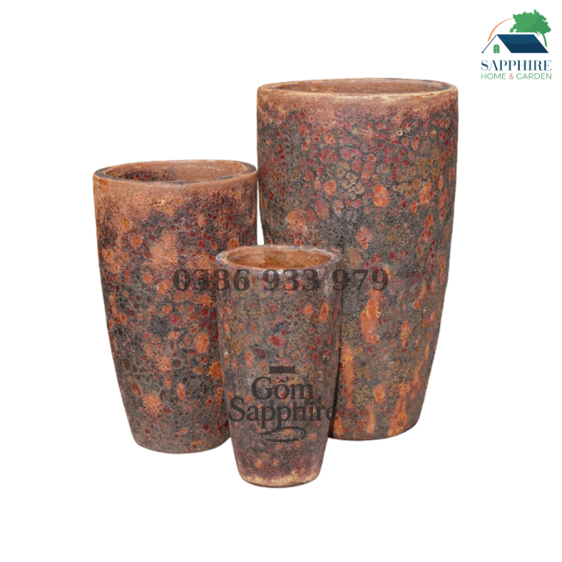 Lấy cảm hứng từ màu đất nung và dấu ấn thời gian trên bề mặt gốm, bộ chậu gốm Rustic mang đến vẻ đẹp mộc mạc, tự nhiên và đậm chất nghệ thuật. Sự pha trộn giữa các tông màu nâu, đỏ và xám được tạo nên từ lớp men sôi độc đáo, tái hiện hình ảnh của đất đá và khoáng chất cổ xưa, giúp từng chiếc chậu trở thành một điểm nhấn tinh tế trong không gian sống.