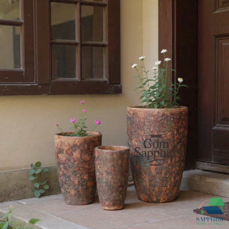 Mỗi sản phẩm được làm thủ công hoàn toàn bởi nghệ nhân gốm Bình Dương, trải qua quá trình nung nhiệt cao trên 1200°C giúp chậu đạt độ cứng chắc, bền màu và có khả năng chống thấm, chống rêu mốc hiệu quả. Bộ chậu phù hợp cho các không gian sân vườn, ban công, hoặc sảnh nhà phong cách rustic – mộc mạc mà sang trọng.