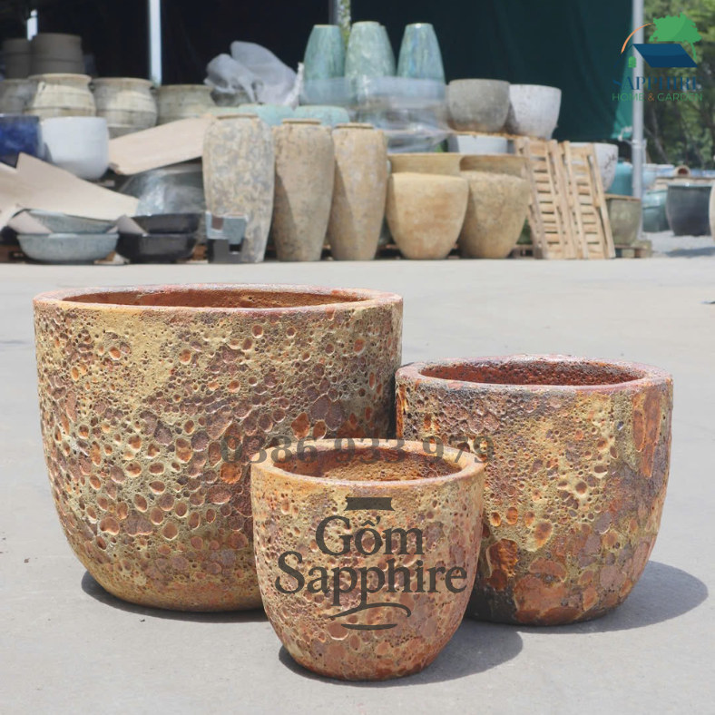 Bề mặt men sôi sần đặc trưng tạo cảm giác thô mộc nhưng lại vô cùng cuốn hút, làm cho mỗi chiếc chậu trở thành một phiên bản độc bản – không chiếc nào giống chiếc nào. Chậu được nung ở nhiệt độ cao, mang đến độ bền vượt trội, chống thấm và chịu nắng mưa tốt, thích hợp sử dụng lâu dài ngoài trời.