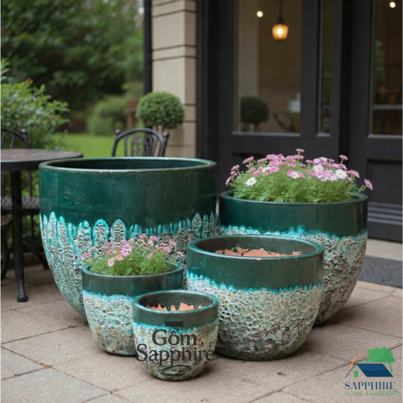 Lấy cảm hứng từ sắc xanh sâu thẳm của đại dương và lớp rêu phong thời gian, bộ chậu gốm men Atlantis xanh rêu mang đến vẻ đẹp vừa mộc mạc, vừa sang trọng cho mọi không gian. Hiệu ứng men sôi đặc trưng Atlantis tạo nên bề mặt chậu độc đáo với những đường men loang, chảy tự nhiên – không chiếc nào giống chiếc nào, đúng tinh thần của nghệ thuật thủ công cao cấp.