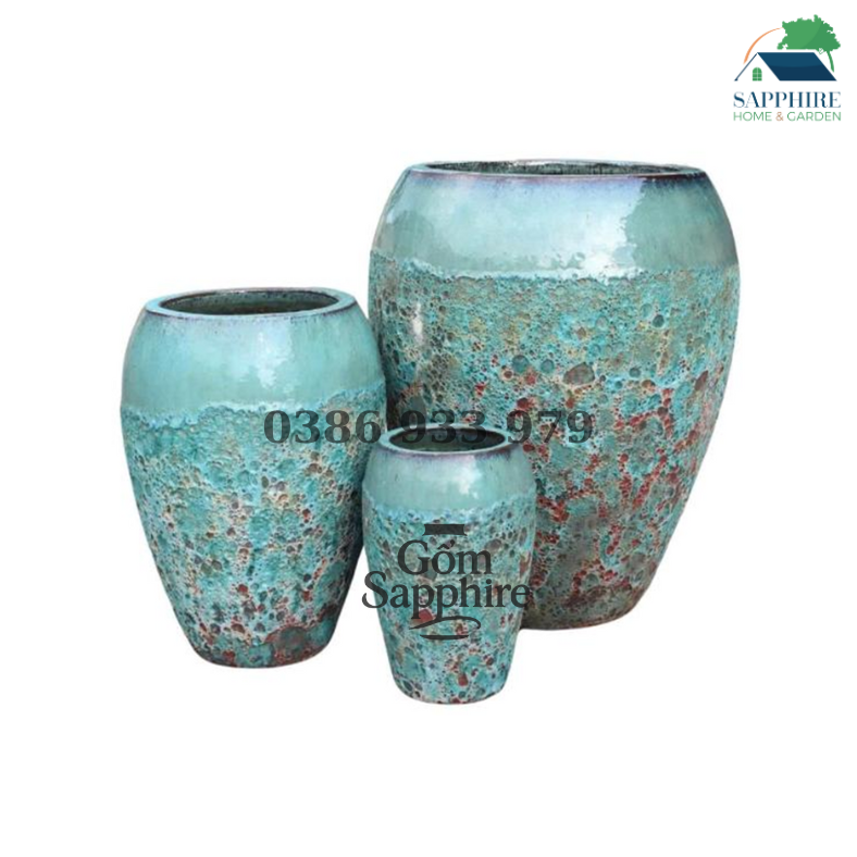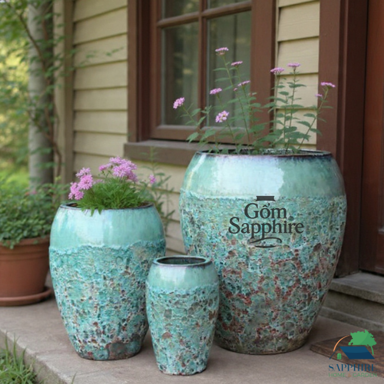 Bộ chậu gốm men xanh ngọc bọt đá mang vẻ đẹp hòa quyện giữa nghệ thuật thủ công truyền thốngphong cách trang trí hiện đại. Với lớp men xanh ngọc óng ánh cùng hiệu ứng bọt đá độc đáo, mỗi sản phẩm là một tác phẩm tự nhiên – không cái nào giống cái nào, thể hiện dấu ấn riêng của bàn tay nghệ nhân.