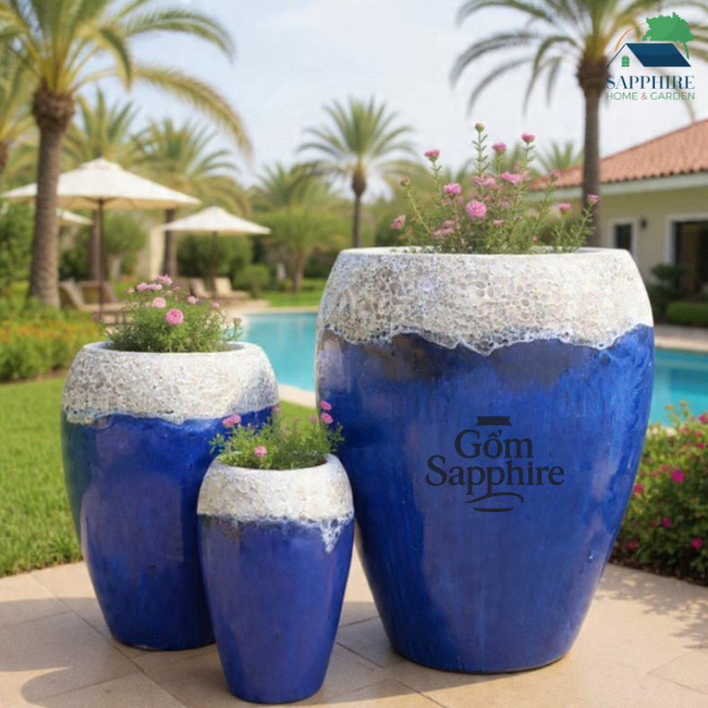 Bộ chậu gốm men xanh nổi bật với gam màu xanh sâu quyến rũ, gợi cảm giác tươi mát và tràn đầy năng lượng như sắc nước biển. Điểm nhấn ấn tượng nhất của sản phẩm nằm ở phần miệng chậu phủ lớp men bong bóng độc đáo – hiệu ứng tạo bề mặt sủi nhẹ, tự nhiên và mang tính nghệ thuật cao.
