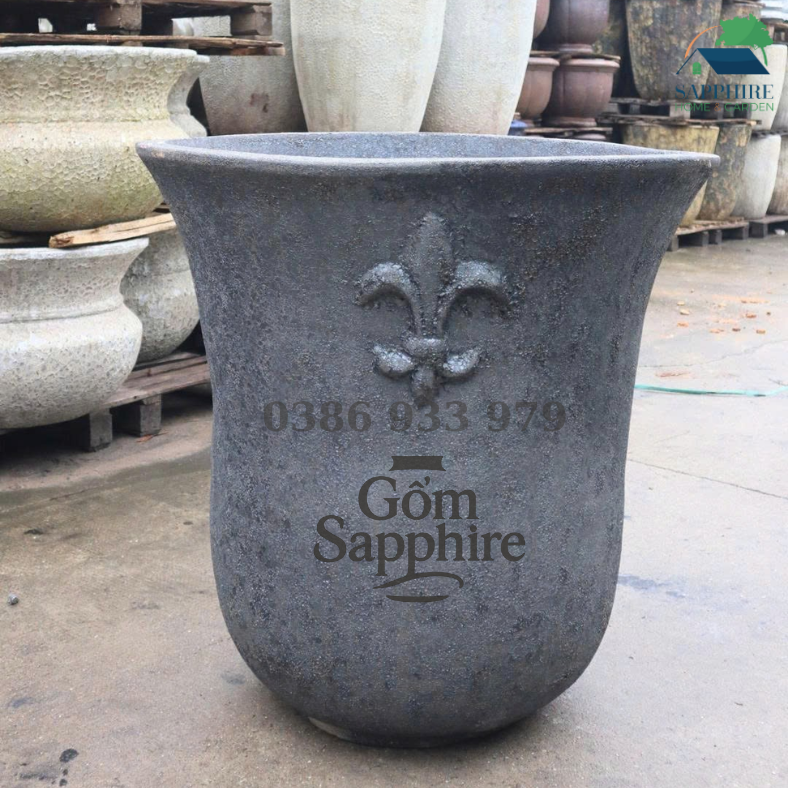 Điểm nhấn của sản phẩm nằm ở họa tiết Fleur-de-lis đắp nổi thủ công trên thân chậu, mang phong cách châu Âu cổ điển, giúp tổng thể trở nên sang trọng và nghệ thuật hơn. Dáng chậu loe miệng – thuôn thân thanh lịch, dễ phối hợp với đa dạng loại cây cảnh như trúc nhật, nguyệt quế, tùng bonsai, lan ý, hay các loại cây lá nội – ngoại thất.