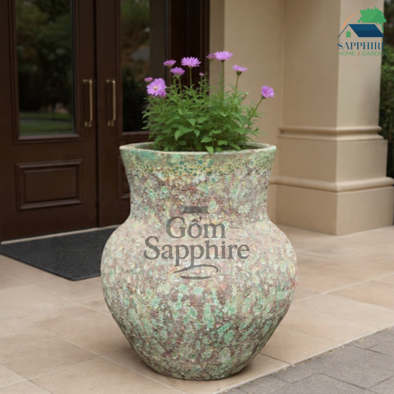 Chậu Green Atlantis sở hữu bề mặt men Atlantis đặc trưng với hiệu ứng “rêu phong tự nhiên”, mang lại vẻ đẹp cổ điển, mộc mạc nhưng đầy tính thẩm mỹ. Sự kết hợp giữa các tông màu xanh rêu, nâu đất và những mảng loang tự nhiên tạo nên cảm giác như một món cổ vật được thời gian bồi đắp.