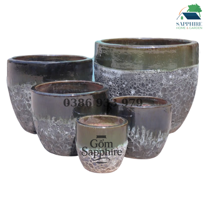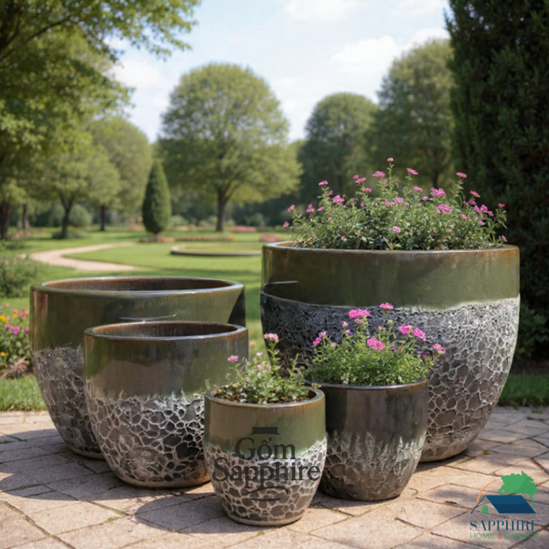 Gam màu nâu đen pha xám khói tạo hiệu ứng ánh sáng tự nhiên, gợi cảm giác trầm ấm và sâu lắng. Bề mặt chậu được phủ men nửa bóng, nửa sần, mang lại chiều sâu thị giác và cảm giác thủ công tinh xảo. Khi đặt trong không gian sân vườn, biệt thự hay khu resort, bộ chậu này trở thành điểm nhấn trang nhã, gợi nhớ đến vẻ đẹp cổ điển xen lẫn hiện đại.